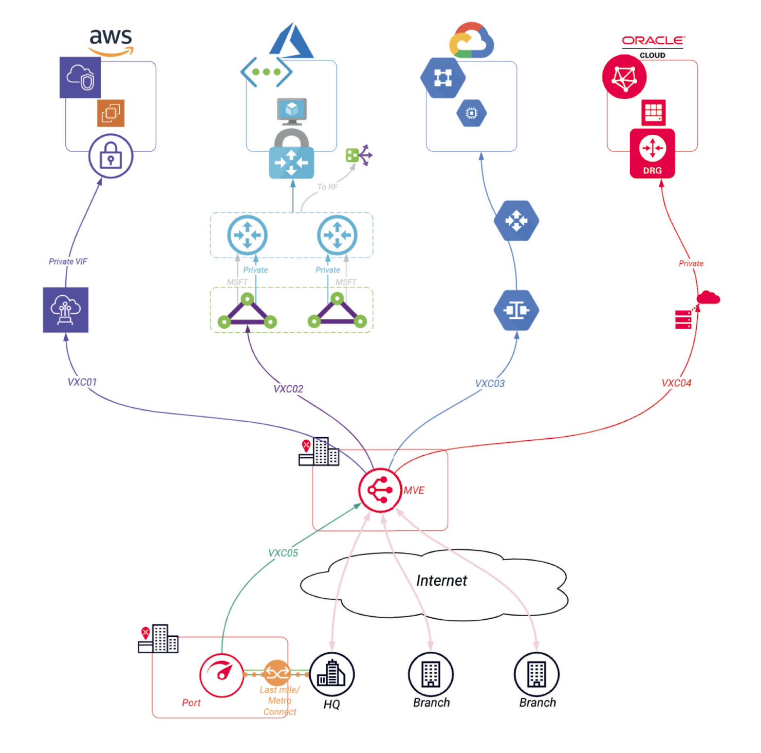 、および Megaport Virtual Edge (MVE)MVE は、オンデマンドでベンダーニュートラルなネットワーク機能仮想化 (NFV) プラットフォームであり、Megaport のグローバルソフトウェア定義ネットワーク (SDN) のエッジでネットワークサービスのための仮想インフラを提供します。SD-WAN や NGFW などのネットワーク技術は、Megaport Virtual Edge を通じて Megaport のグローバルネットワーク上で直接ホストされます。