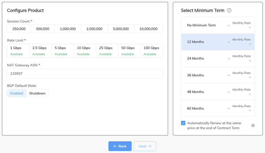 Minimum Term – Select No Minimum Term, 12 Months, 24 Months, 36 Months, 48 Months, or 60 Months. Longer terms result in a lower monthly rate. 12 Months is selected by default. Take note of the information on the screen to avoid early termination fees (ETF).
